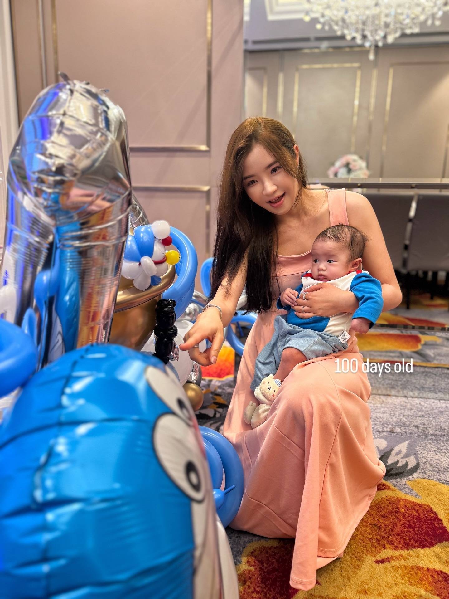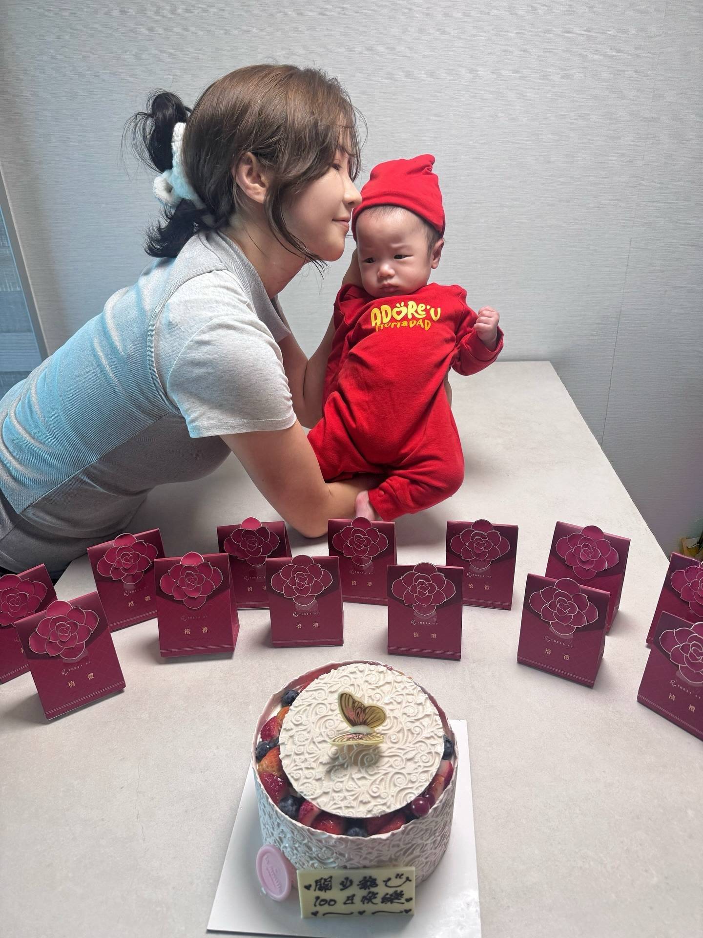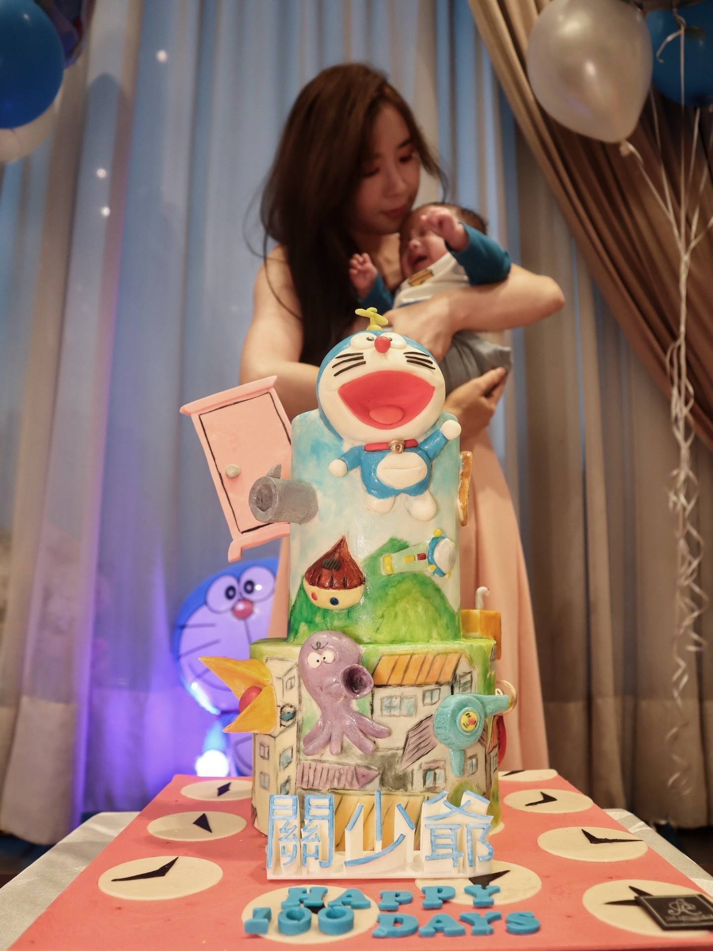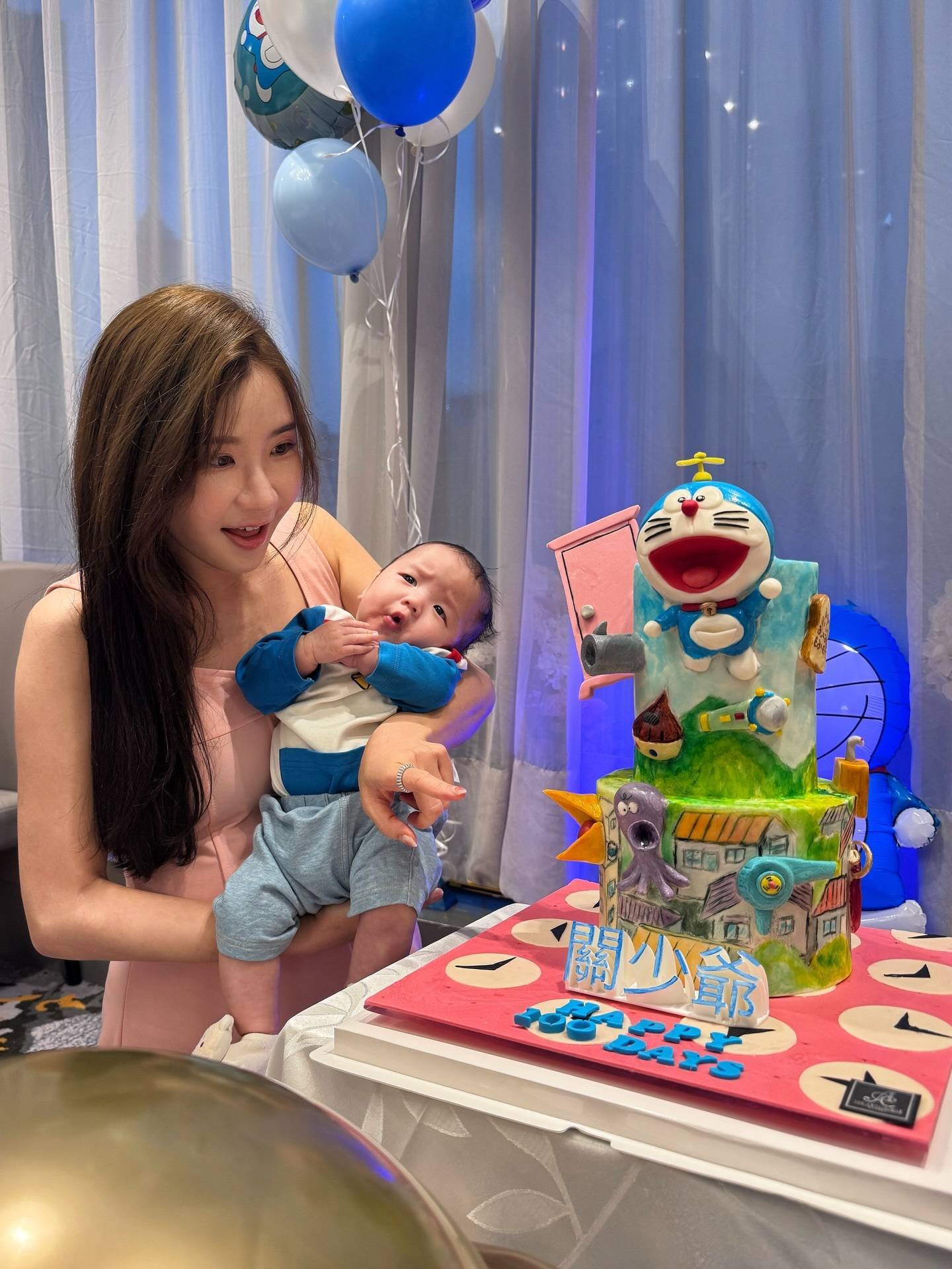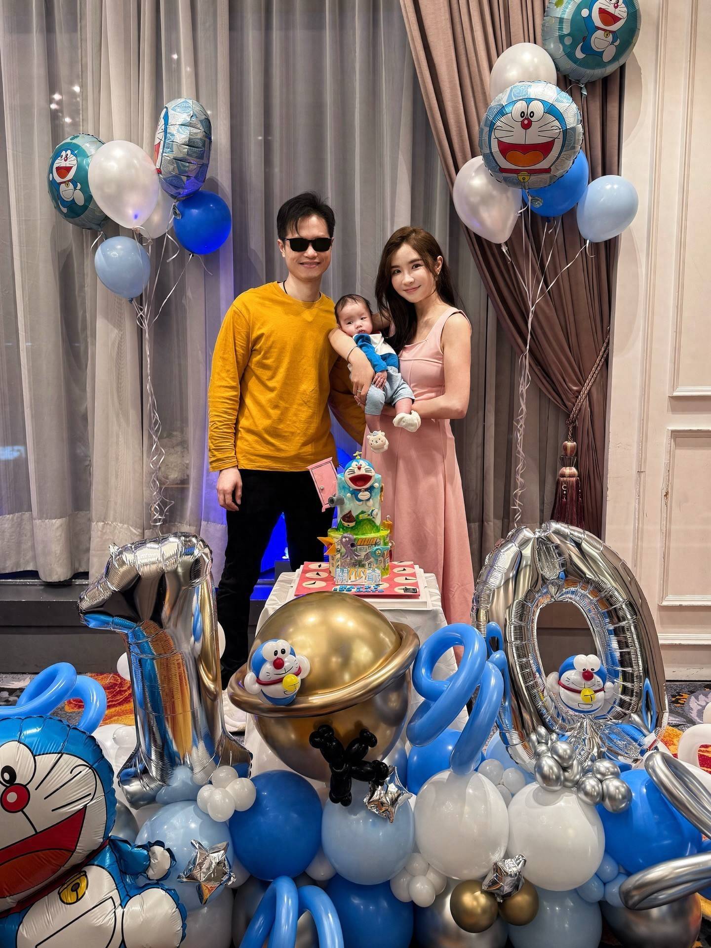 利颖怡晒出了一系列温馨家庭照。照片中,其丈夫的样貌依旧被遮挡保护,“关少爷”的百日派对以哆啦A梦主题气球与蛋糕装饰,宝宝本人也身穿同款服装,眼睛炯炯有神,模样可爱。利颖怡还在家中用另一款蛋糕打卡,为儿子连续庆祝这个特殊的日子。