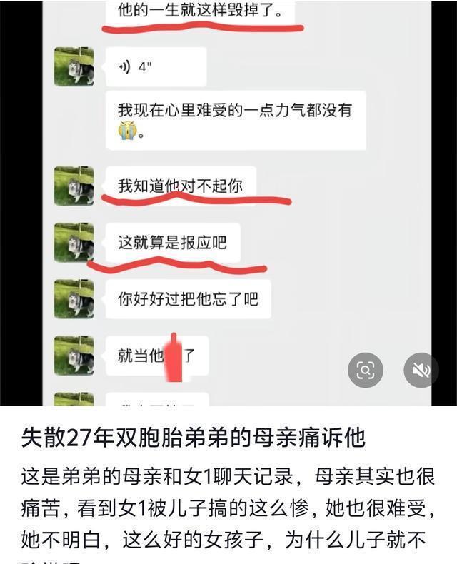 亲妈说这算是报应 另一方面,有人曝出了双胞胎弟弟前女友和妈妈的聊天截图。聊天记录显示, 弟弟的妈妈也管不住自己的儿子,她让弟弟的女友离开他,把他忘了,弟弟这辈子算是没有前途了,这都是报应。