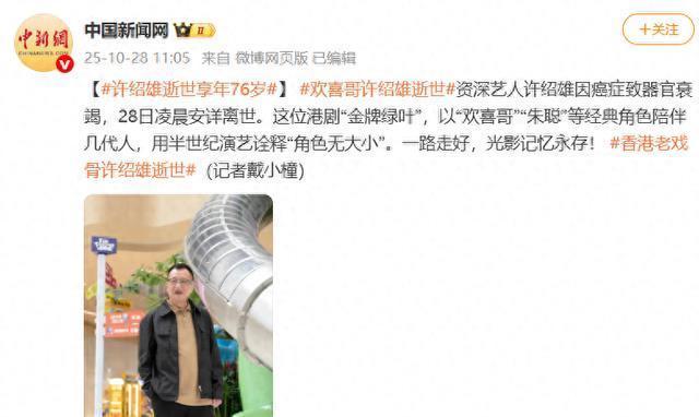 资深艺人许绍雄因癌症致器官衰竭,28日凌晨安详离世,享年76岁。