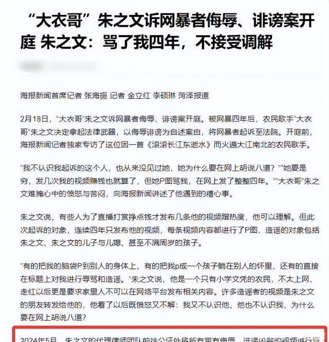 不过前儿媳也没好过到哪去,在离开大衣哥后她也没什么流量了,事业也大幅缩水,只能说这一次离婚是双输的结果。 不过现在去他家的人也少了,近几年那个造谣生事的人也受到应有的惩罚,相信他以后的日子将会变得更加的美好。 不知道您对此有什么看法呢?欢迎在下方评论区留下你的想法,喜欢文章记得点赞关注我们下期再见。 [免责声明]文章的时间、过程、图片均来自于网络,文章旨在传播正能量,均无低俗等不良引导,请观众勿对号入座,并上升到人身攻击等方面。观众理性看待本事件,切勿留下主观臆断的恶意评论,互联网不是法外之地。本文如若真实性存在争议、事件版权或图片侵权问题,请及时联系作者,我们将予以删除。 信息来源:百度朱之文 “大衣哥”15年纳税1.18亿?工作人员:从未公布过此类数据.潇湘晨报.2025-03-08 山东大衣哥朱之文回应热度下降:现在也没人踹门了,不愁吃穿,比以前干建筑打工要强,有公益活动分文不取.大象新闻 “大衣哥”赢了!网曝朱之文女子,被判刑!.海报新闻[引用日期2025-11-01]